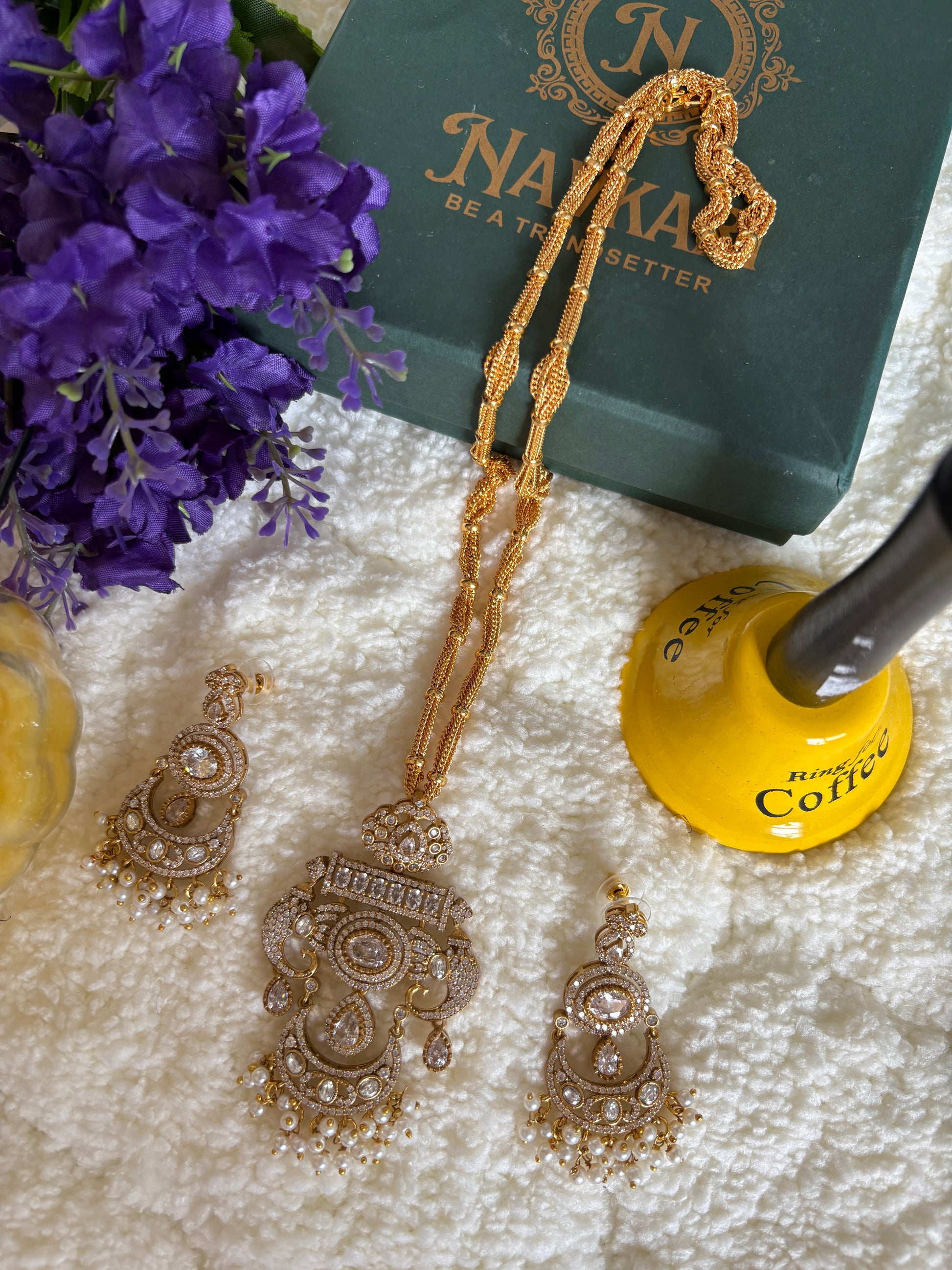 Elegant long American Diamond necklace crafted in premium Brass with sparkling diamonds, designed to add grace and richness to your ethnic look.