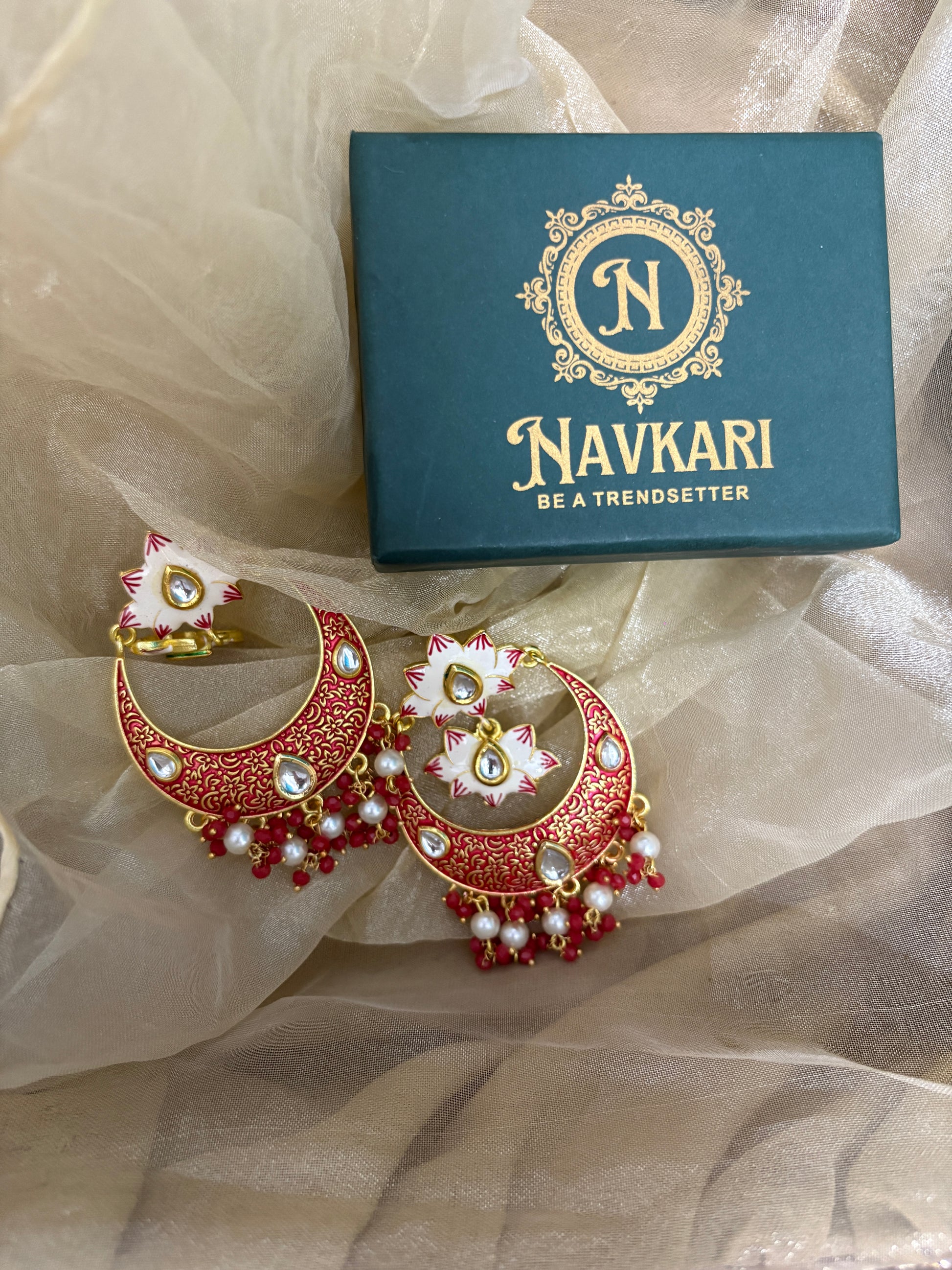 Enhance your look with these stunning Red Colour Brass Chandbalis. Made of high-quality brass, these chandbalis feature a bold red hue that adds a pop of color to any outfit. Their intricate design and lightweight construction make them perfect for any occasion. Elevate your style with these elegant chandbalis.