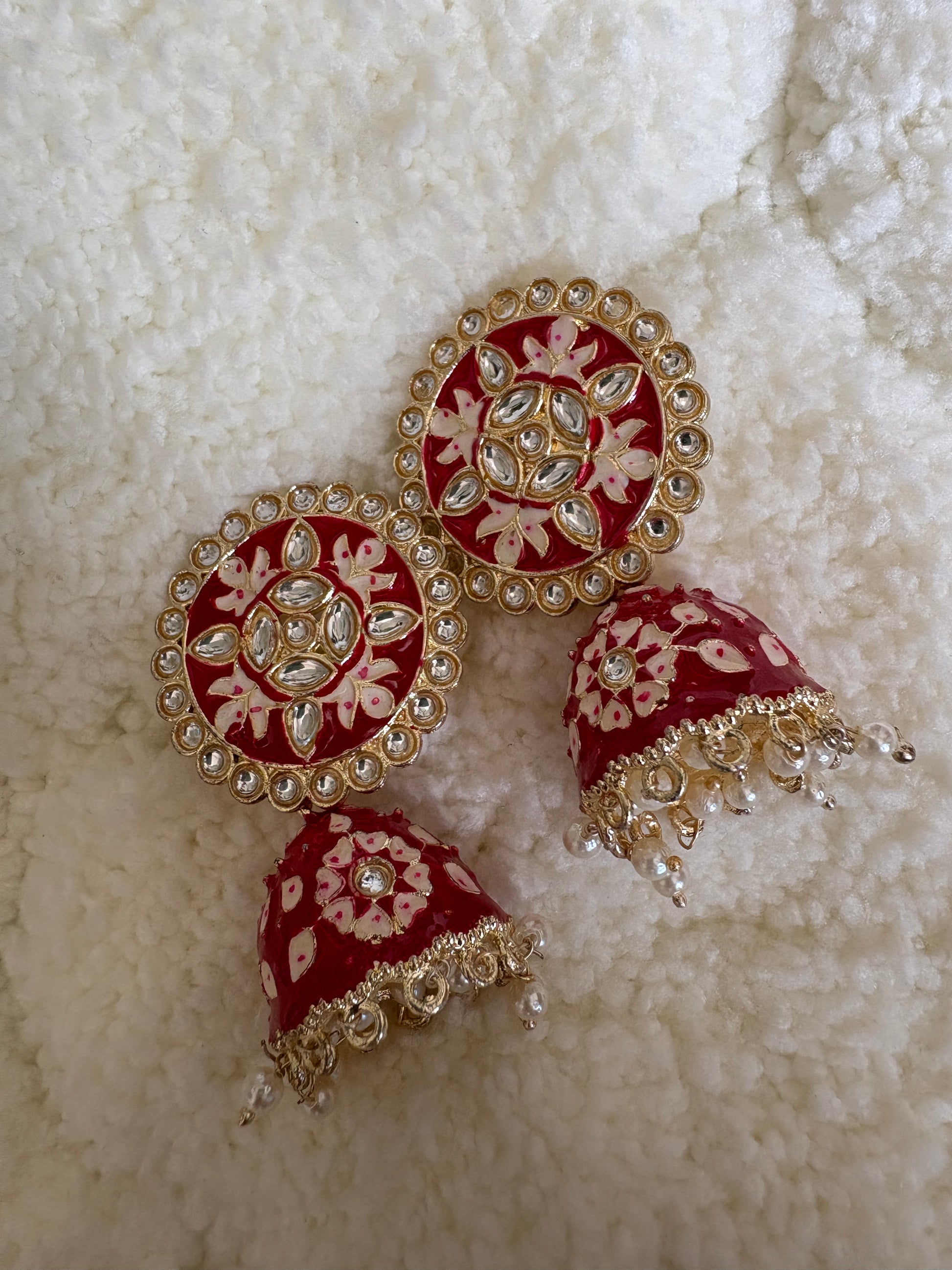These red colour kundan meenakari earrings showcase expert craftsmanship, blending traditional kundan stone setting with vibrant meenakari enamel work. The striking red hue enhances any outfit with a touch of elegance and cultural richness. Perfect for special occasions, they offer a timeless accessory that reflects skilled artistry and refined taste.