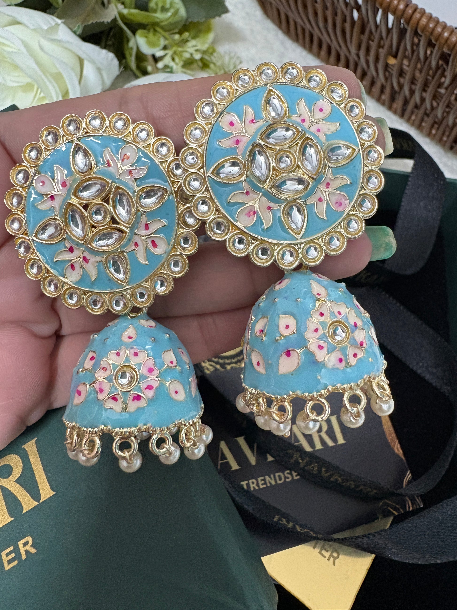 Sky Blue Meenakari Kundan Jhumki Earrings
